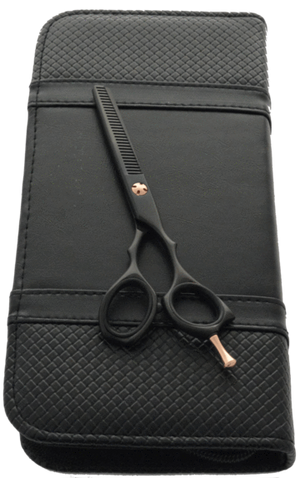 Diese Schere in Mattschwarz mit roségoldenen Akzenten ist ein absoluter Hingucker und die Qualität ist vom ersten Augenblick an sichtbar. Die mattschwarze Ausfürung der Scheren fühlt sich elegant und schön an und wird von unserem Klingenschmied perfekt für dich ausbalanciert.